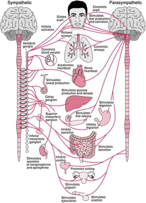 Otonom Sinir Sistemi 2 bölümdür; Sempatik ve Parasempatik Sinir Sistemleri. Bu iki sistem birbirlerinin antagonisti (tersi) şeklinde çalışır. Stres altında Sempatik Sinir Sistemi, dinlenim halinde Parasempatik Sinir Sistemi aktiftir.