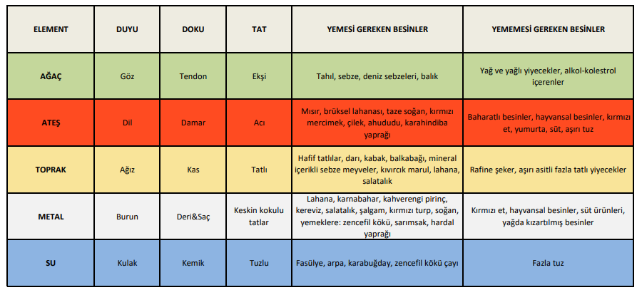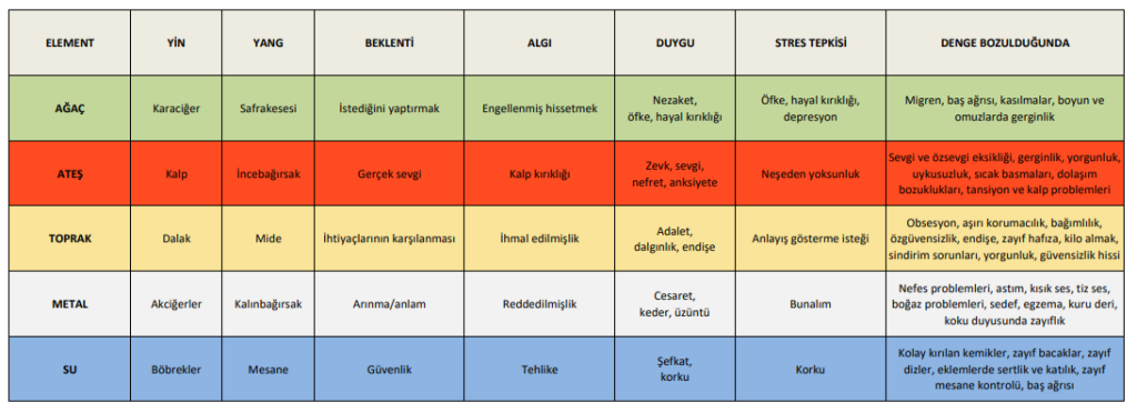 Geleneksel Çin Tıbbında (TCM) her organın meridyeni ve duygu durumu vardır. 5 element: Ağaç, Ateş, Toprak, Metal, Su